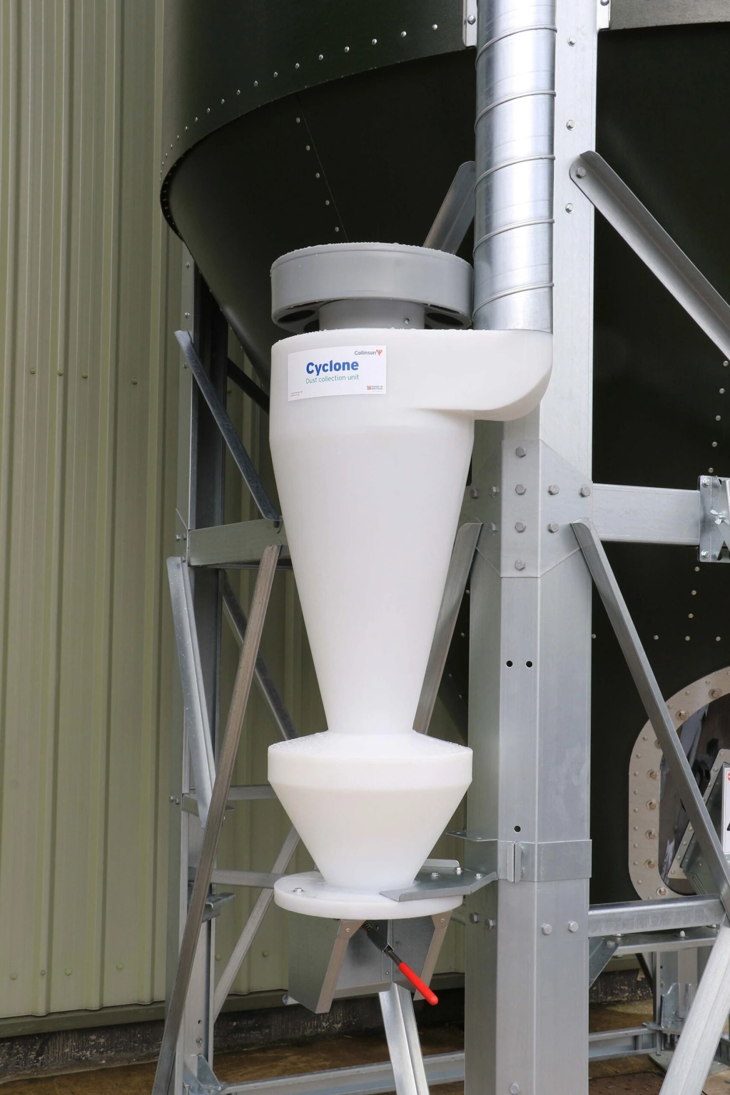 The Cyclone connects to the silo exhaust via a steel pipe and collects the dust that would normally escape during pneumatic filling