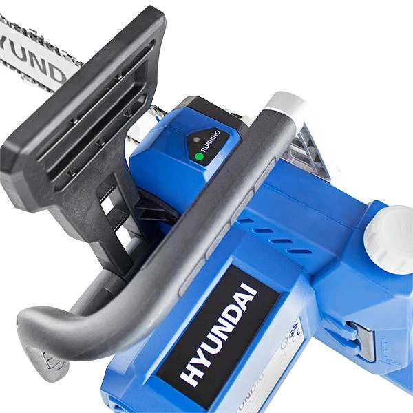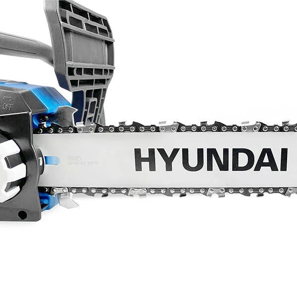 Hyundai Electric Chainsaw HYC1600E The HYC1600E is a lightweight electric chainsaw from Hyundai Powered by a 1600W motor, it is the ideal chainsaw for day-to-day woodcutting tasks including felling small to medium-sized trees and cutting logs 14″ cutting bar The 14 inch (35cm) bar has a 13m/s chain speed to provide excellent medium-duty cutting power, perfect for a range of tasks around the garden Comfortable to use Lightweight at just 3.9kg, the HYC1600E also features an ergonomic soft grip rear handle, which makes the chainsaw comfortable to use for extended periods and also makes it extra easy to handle Easy to assemble This corded electric chainsaw is quick and easy to assemble out of the box with no tools needed, so you can get started on any gardening tasks as soon as possible Sturdy and long-lasting To increase the Hyundai HYC1600E electric saw’s lifespan, it includes a handle-mounted cable loop to prevent any excessive tension, or the cable being pulled from the machine Easy to maintain The transparent chain oil tank, visible from both sides of the 1600W chainsaw, can easily be checked and topped up to help extend chain life Note that we recommended to use a good quality chain lubrication oil To make using this chainsaw as simple as possible, the HYC1600E features tool-less, one-handed chain tensioning and automatic chain lubrication, allowing you to get the very best performance out of your chainsaw and minimising any interruption to your gardening Safe to use The Hyundai HYC1600E has an electric/mechanical chain brake which is activated in the event of a kick-back by pushing the brake handle forward, stopping the chainsaw in approximately 0.15 seconds Its toughened steel spiked bumper also improves stability for controlled cutting Electric-powered Easy and safe to use, the main advantages of electric chainsaws over petrol engine chainsaws are: no highly flammable petrol, no 2-stroke oil to mix with the petrol, low noise levels and no pull-starting problems Peace of mind The HYC1600E corded electric chainsaw comes with a 3 year Hyundai warranty with full UK parts and service backup to maintain your saw for years to come At a glance: Powerful 1600W / 230V motor 14” (35cm) bar and chain Tool-less, one-handed chain tensioning for easy maintenance 0.15 second quick-stop electric/mechanical chain brake Automatic chain lubrication and easy-view oil tank Toughened steel spiked bumper improves stability for controlled cutting Quick and simple tool-free assembly Safe, comfortable and easy to use, weighing just 3.9kg Covered by a 3 year Hyundai warranty In The Box HYC1600E Electric Chainsaw 14″ Oregon Bar 14″ Oregon Chain Bar Cover User Manual Important Please visit our chainsaw safety page before using a chainsaw Click here Key Features: Powerful 1600W motor: Ideal for felling small to medium-sized trees and cutting logs 14″ bar with 13m/s chain: Provides excellent medium-duty cutting power Easy to maintain: Tool-free assembly and automatic chain lubrication system Weighs just 3.9kg: Lightweight and easy to use Generous 3m power cable: Saves you having to reach for an extension lead Ergonomic design: Comfortable to use for extended periods Peace of mind: 3 year Hyundai warranty