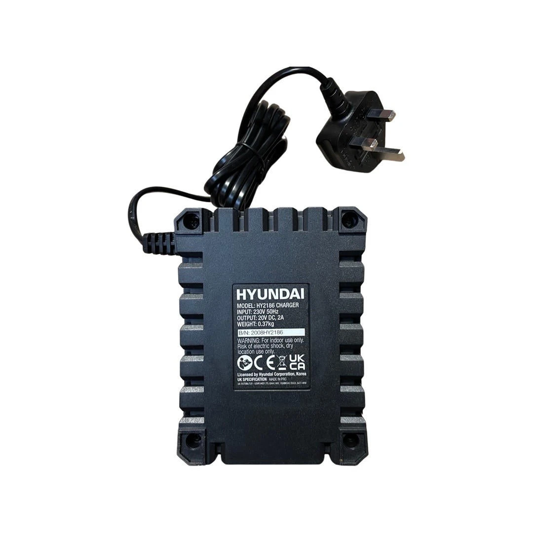20v Battery Charger Hyundai HY2186 20V lithium-ion battery charger designed for charging the batteries of our 20v MAX Hyundai cordless, battery-powered garden machinery and power tools range, including our chainsaw, leaf blowers, lawn mower, grass trimmer, hedge trimmer, pole hedge trimmer, pole saw/pruner, rotary sander, circular saw, jigsaw, reciprocating saw, angle grinder, impact wrench, impact driver and drill driver Backup or Replacement 20v Battery Charger This battery charger is ideal as a second battery charger for our 20v mower or as a replacement charger for any of our 20v garden machinery and power tools 3 Year Warranty For added peace of mind, this battery charger is covered by our Hyundai 3 year platinum warranty Key Features: 20v battery charger: Designed for charging our 20v lithium-ion batteries from our 20v garden machinery and power tools range Ideal as a secondary or replacement battery charger: Ideal as a second battery charger Peace of mind: 3 year Hyundai platinum warranty