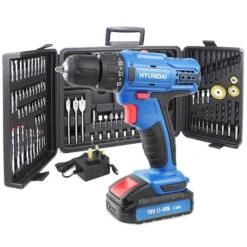The HY2175 is a highly versatile, lightweight, ergonomically designed cordless 18v battery powered drill with a 1500mAH lithium-ion battery and 89 piece accessory kit from Hyundai Fitted with Hyundai’s powerful 18v motor and 2-speed gear drive system the HY2175 cordless drill has specially developed air inlets to ensure optimum motor cooling for a longer lifespan Fitted with a huge 20+1 torque settings helping to prevent overdriving screws into delicate surfaces such as drywall or damaging small or fragile screws The 10mm ” keyless chuck and spindle lock allows you to change the drill and screwdriver attachments quickly and easily The HY2175 cordless drill also features a 2-speed gearbox to ensure you have the correct speed for all drill sizes and a reverse function for use as a drill driver for inserting and removing screws Fitted with a soft grip handle provides all round comfort for the user while maintaining outstanding precision, the built-in variable speed trigger allows complete control over the drilling speed, simply adjust the pressure applied to the trigger for maximum fingertip control Designed for drilling a variety of materials including, wood, plastic, tile, rubber and metal the HY2175 is ideal for any DIY and home improvements Contained in a heavy-duty lightweight plastic carry box the HY2175 comes with 89 accessories that include a selection of popular sizes of HSS twist drills, tungsten carbide tipped masonry drills, wood boring drills, flat wood drill bits, rotary burrs, wire brushes and a combination of 25mm and 50mm screwdriver bits The lithium-ion 18v battery provides longer life between charges and torque when it is needed The HY2175 can be recharged between 3 – 5 hours With a compact and lightweight design, weighing just 1.4kg, this drill is easy to transport and store and use for an extended period of time In The Box: HY2175 18V Cordless Drill, 18v 1500mAh Li-Ion Battery, Lithium-Ion Battery Charger, Carry Case & 89 Piece accessory kit which includes: A selection of popular sizes of HSS twist drills Tungsten carbide tipped masonry drills Wood-boring drills Flatwood drill bits Rotary burrs Wire brushes A combination of 25mm and 50mm screwdriver bits Covered by Hyundai 1 year standard warranty Powered by Hyundai 18V Lithium-Ion 1500mAh rechargeable battery 2-speed gearbox covers a wide range of drill diameters 10mm Keyless Chuck Keyless chuck allows you to easily change drill bits in seconds with minimal interruption to your work 89 piece drill bit & accessories contained in a lightweight carry box 20+1 torque, reverse function and variable speed trigger control Battery temperature thermal protection No load speed 1: 0-350rpm or 2: 0-1300rpm Covered by Hyundai 1 year warranty Spare battery available as an option Key Features: Powered by Hyundai 18V Lithium-Ion 1500mAh rechargeable battery 2-speed gearbox covers a wide range of drill diameters 10mm Keyless Chuck Keyless chuck allows you to easily change drill bits in seconds with minimal interruption to your work 54 piece drill bit & accessories contained in a lightweight carry box 20+1 torque, reverse function and variable speed trigger control Battery temperature thermal protection No load speed 1: 0-350rpm or 2: 0-1300rpm Covered by Hyundai 1 year warranty Spare battery available as an option