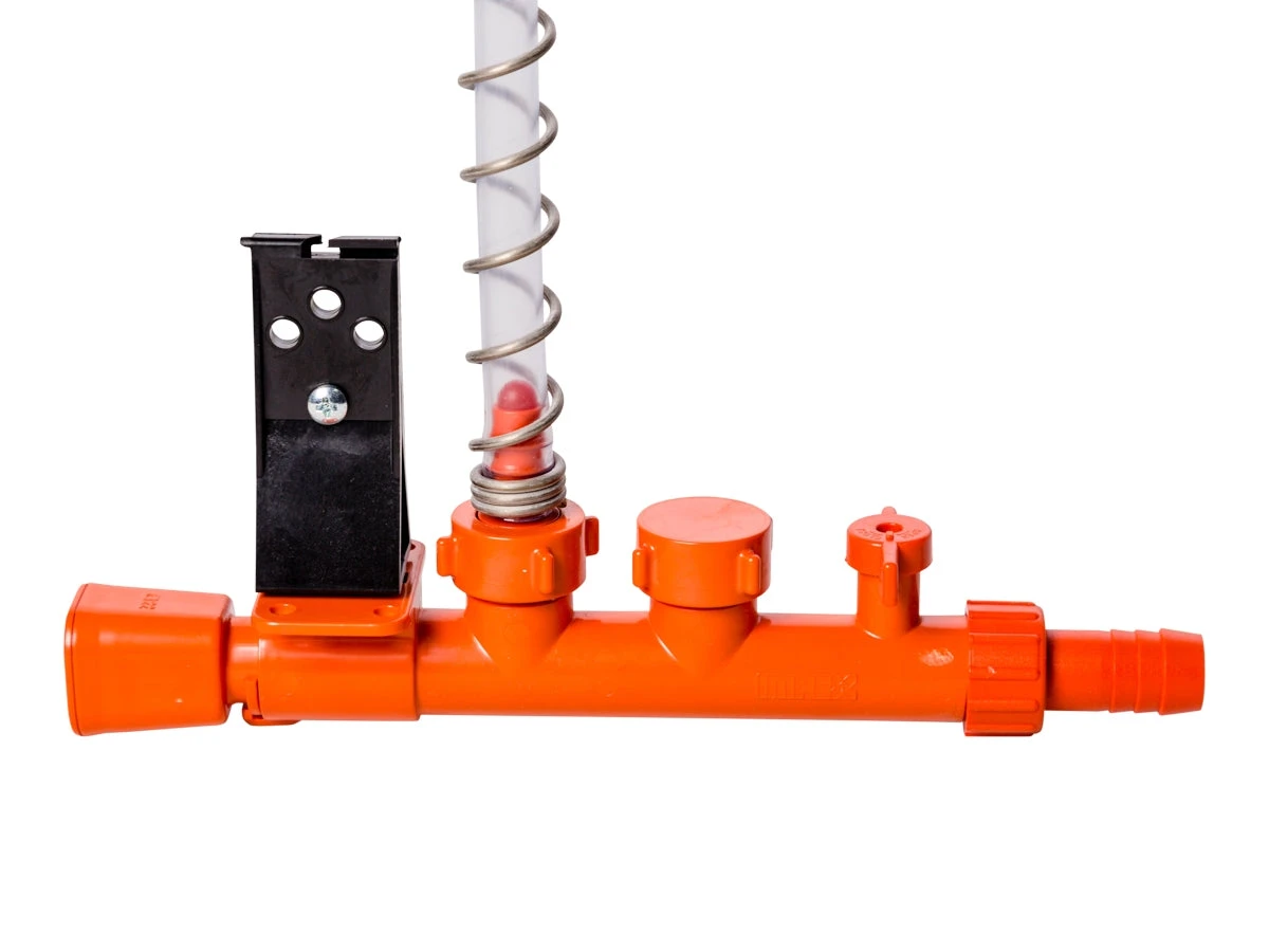 The I-Flow end air outlet set is installed at the end of each drinking line. The end set has three exits: one for the air outlet tube, one to connect a drainage pipe for flushing and one for use when the drinking line is drained. To open or close the end set, the integrated two-way ball valve is used. The air outlet tube automatically closes during flushing. With several types of clamps and connectors, the I-Flow end set can be used for various drinking systems