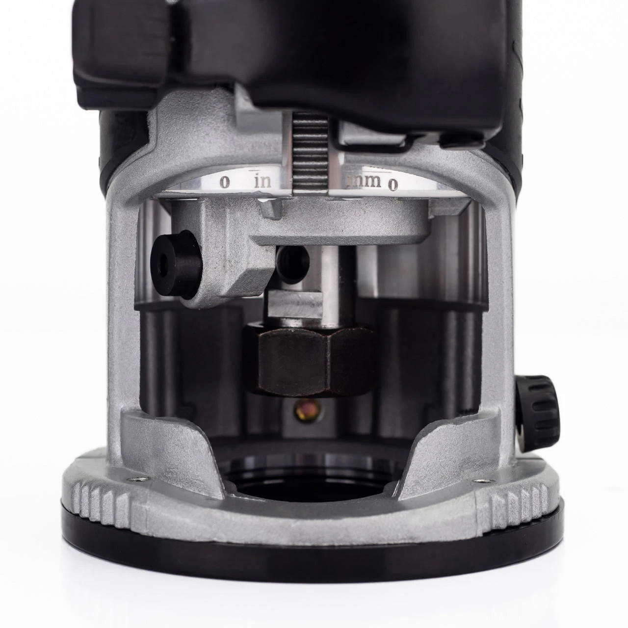18V ROUTER BASE bare unit 18V Trimmer Router with Brushless Motor Technology 25% more power – Brushless motors have fewer moving parts results in a quiet motor that never needs maintenance The reduced friction enables a better use of available energy from the battery pack as there is no resistance from brushes 50% more run time – Brushless motor technology means the carbon brush resistance is eliminated, so less battery energy is wasted The efficiency of a brushless motor results in a greater run time from each charge Variable speed with soft start for control and consistent application into a variety of materials Vacuum adaptor included for dust extraction Lock on/off switch for added safety 3/8″ and ¼” Collet suitable for most sizes of router bits Built in LED for improved visibility Ergonomic design for increased user comfort Key Features: Powerful 18V Trimmer Router with Brushless Motor Technology Variable speed with soft start for control and consistent application into a variety of materials Vacuum adaptor included for dust extraction & Lock on/off switch for added safety 3/8″ and ¼” Collet suitable for most sizes of router bits Built in LED for improved visibility & Ergonomic design for increased user comfort Routers can be used to cut patterns, grooves, and designs across multiple pieces of wood This tool is sold as a ‘Bare’ Tool (without a battery or charger) but is compatible with all batteries and chargers across the 18V JCB power tool range Backed up by UK support and our JCB 3 Year Warranty