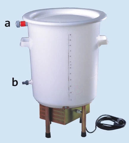 The medication liquid will be sucked by the Dosatron Medicator into the water supply line. In the Mixer lid, with childproof safety catch, there is an opening for the suction hose. As soon as the quantity of medicine has depleted, fresh water automatically goes to the valve (b) and cleans the system and the medicator